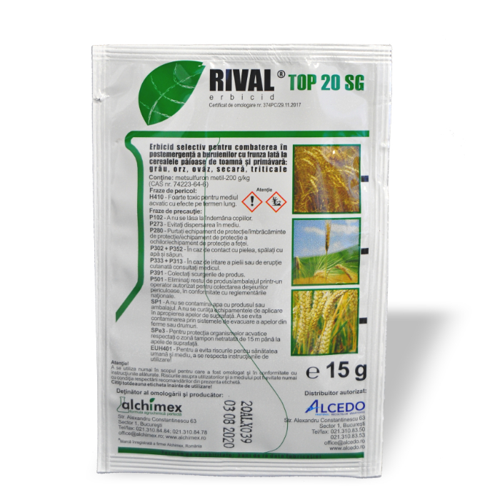 Download technical datasheetRIVAL® TOP 20 SG is a fine-grained, homogeneous, water-soluble, brown, lignin light-smelling herbicide containing 200 g / kg metsulfuron-methyl.