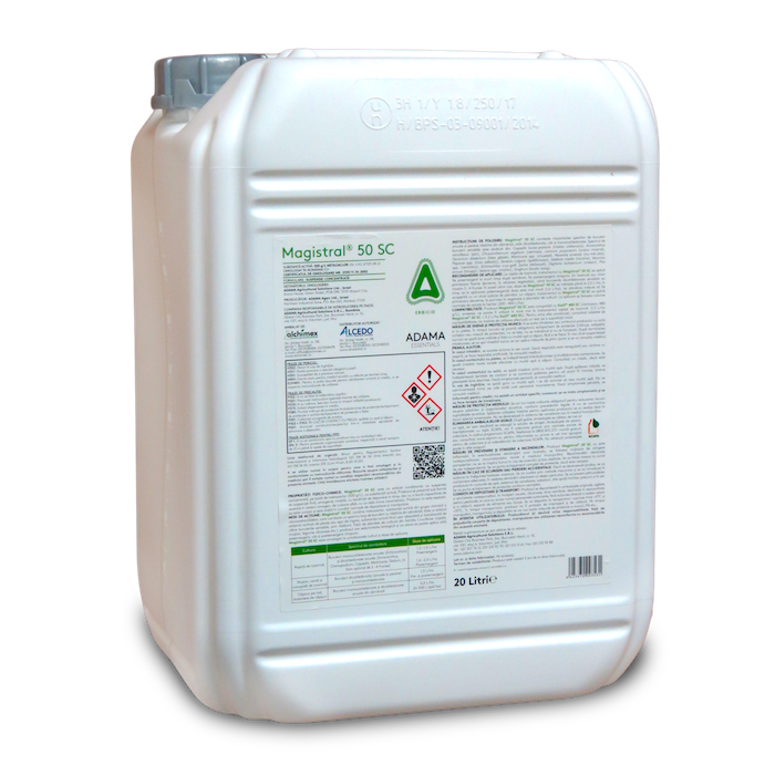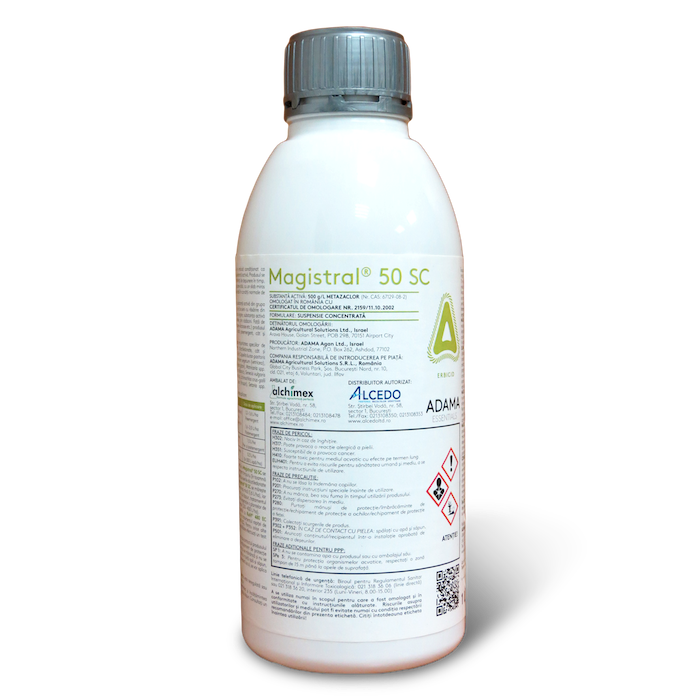 Descarcă fișa cu date tehnice de securitateMAGISTRAL® 50 SC este un erbicid condiționat ca suspensie concentrată, pe bază de metazaclor (500 g/l), ca substanță activă. Produsul se prezintă sub formă de suspensie fină, omogenă, mobilă, cu tendință de depunere în timp, dar cu o bună capacitate de revenire în sistem omogen, de culoare albă, cu un slab miros caracteristic. Produsul nu este exploziv, nu este coroziv și este stabil în condiții normale de depozitare și manipulare.